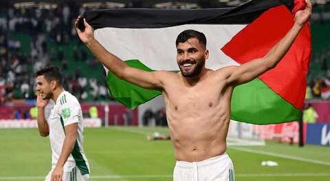 برز حسين بن عيادة، مدافع المنتخب الوطني، في نهاية لقاء ربع النهائي ضد منتخب المغرب، برفعه العلم الفلسطيني، برفقة عدد من اللاعبين.