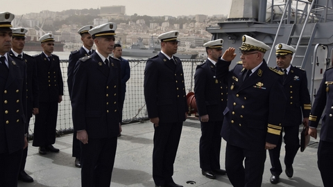 أشرف اللواء محفوظ بن مداح، قائد القوات البحرية، الأحد، بالرصيف الشمالي للأميرالية القاعدة البحرية الجزائر العاصمة، بالناحية العسكرية الأولى، على مراسم تفتيش سفينة الإنزال والتدعيم الإمدادي “قلعة بني حماد”، رقم المتن 472.