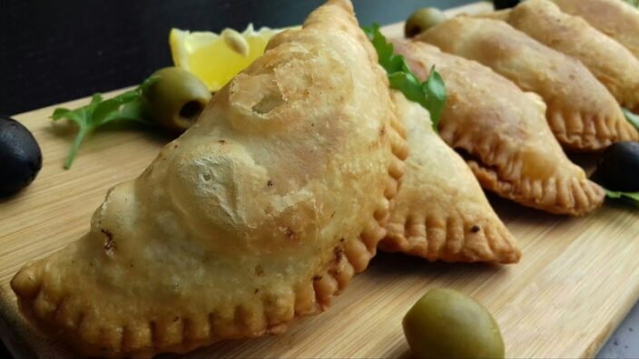 في ايناء نضع الفرينة،الملح وخميرة الحلويات ثم نضيف السمن والزيت و نبسس جيدا الفرينة بين كفي اليد، نبدأ بإضافة الماء بالتدريج ونجمع العجين بدون عجن حتى نتحصل على عجين طري متجانس، نحفظه بكيس بلاستيكي ليرتاح مدة 15 دقيقة بعها نأخذ العجين ونحله بطاولة العمل دون استعمال الفرينة على شكل مستطيل، نقوم بطيه مثل العجين المورق اي نقوم بعملية التوريق على ثلات مرات بدون اضافة اي شيء ثم نترك العجين ترتاح 15 دقيقة اخرى ثم نحل العجين رقيقة جدا ونشكل دوائر نملأ نصف الدائرة بالحشو الذي يكون قد برد تماما ثم نطوي الدائرة حتى نتحصل على نصف دائرة ونضغط جيدا على الحافة بالشوكة و يستحسن قبل القلي نتركهم بالثلاجة لمدة ساعتين، تقلى على نار متوسطة بالاستعانة بملعقة نقوم تفريغ الزيت فوق الحبة لكي تتشكل الفقعات مثل ما نطهو حلوة الصامصة