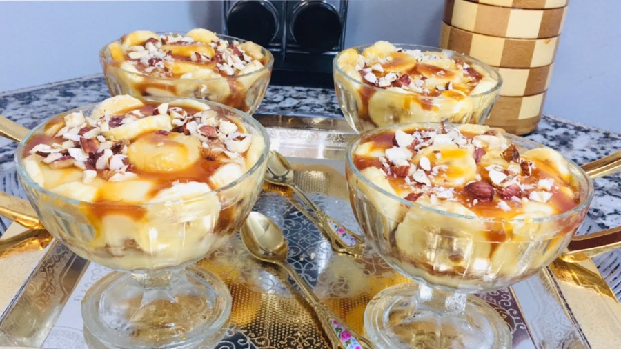 نضع في أكواب التقديم كطبقة أولى بسكويت مفتت ثم طبقة من الموز ثم كريمة الموز، يليها الكريمة المخفوقة ثم نعيد الكرّة البيسكوي، الموز، كريمة الموز، الكريمة المخفوقة وهكذا حتى آخر طبقة كريمة الموز ثم تزين بملعقة صغيرة من الكريمة مخفوقة وقطعة بيسكوي وقطعة موز.