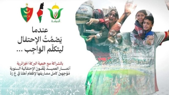 وجاء في بيان تم اصداره بالمناسبة: “في ظل الظروف الإنسانية الصعبة التي يعيشها أهلنا في غزة الجريحة، يعتزم أنصار نادي مولودية الجزائر وبالشراكة مع جمعية البركة الجزائرية إلغاء الاحتفالية السنوية الخاصة بالنادي والتي تصادف 8 من أوت الجاري، مع تحويل كامل ميزانيتها لدعم إخوتنا في قطاع غزة”. وحسب ما أعلن عنه رئيس جمعية “البركة” الخيرية، أحمد الإبراهيمي، فإن مصاريف الحفل الضخم الذي كان يحضر له أنصار العميد سيتم تخصيصها لإطعام إخواننا في غزة عبر جمعية البركة الناشطة في العمل الإنساني داخل وخارج الوطن.