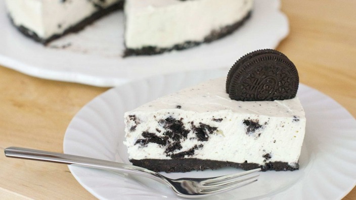 - نزيّن سطح الكيك بـ 8 قطع بسكويت أوريو مع الضغط بلطف لتثبيت البسكويت، ثم نضع التشيز كيك في البراد لترتاح لمدة ليلة كاملة.