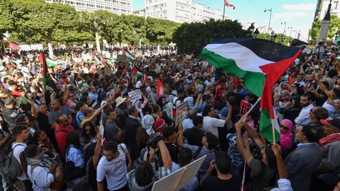 خرجت تظاهرة حاشدة في تونس، الأحد، أمام السفارة الأميركية احتجاجاً على العدوان الإسرائيلي ونصرةً لغزة وفلسطين.
