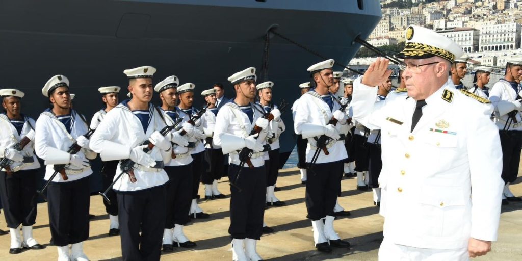 أشرف اللواء محفوظ بن مداح، قائد القوات البحرية، بالرصيف الشمالي للأميرالية القاعدة البحرية الجزائر بالناحية العسكرية الأولى، على مراسم تفتيش الفرقاطة متعددة المهام “المدمر”، رقم المتن 911.