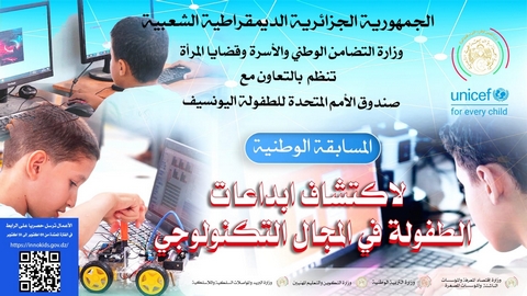 تُنظم وزارة التضامن الوطني والأسرة وقضايا المرأة ، بالتعاون مع صندوق الأمم المتحدة للطفولة ” اليونسيف”، فعاليات المسابقة الوطنية للأطفال والخاصة ب “اكتشاف المواهب التكنولوجية والبرمجية” بمشاركة كل من وزارة البريد و المواصلات السلكية و اللاسلكية و وزارة التربية الوطنية و وزارة التكوين و التعليم المهنيين و وزارة اقتصاد المعرفة و المؤسسات الناشئة و المؤسسات المصغرة