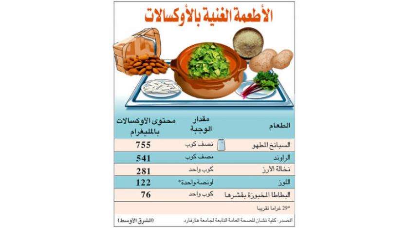 وينصح الدكتور إيزنر بتجنب الأطعمة التي يزيد محتوى الأوكسالات فيها عن 75 ملليغراماً لكل 100 غرام من الوجبات، مثل المكسرات والسبانخ والراوند.