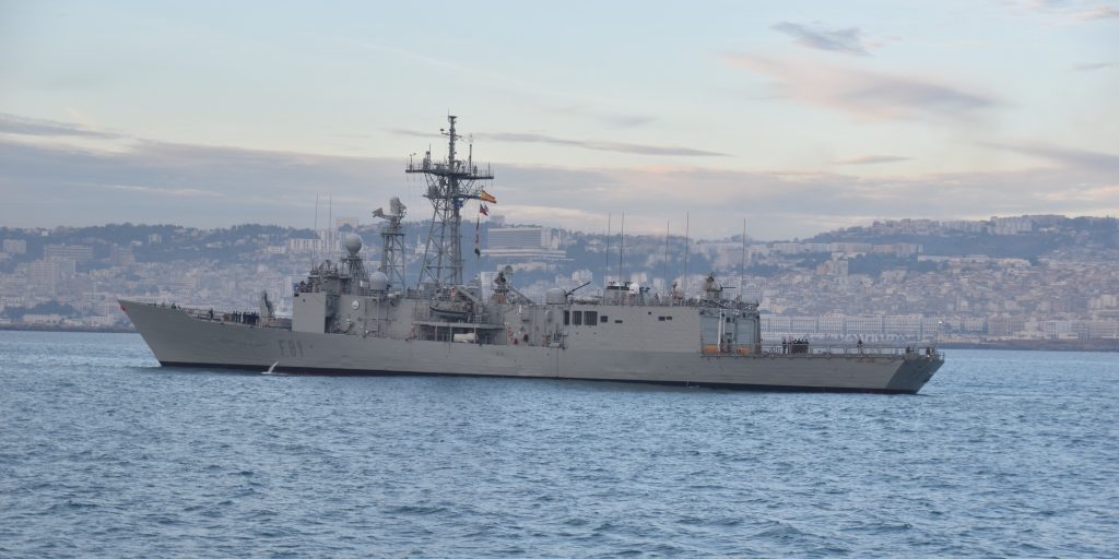 في إطار تنفيذ برنامج التعاون العسكري الثنائي، مع منظمة حلف شمال الأطلسي، رست، الإثنين، الفرقاطة “SANTA MARIA F-81” التابعة للبحرية الإسبانية بميناء الجزائر، حيث ستقوم خلالها رفقة قاطرة أعالي البحار “المنجد”، رقم المتن 701، التابعة للقوات البحرية في تمرين “باسيكس”.