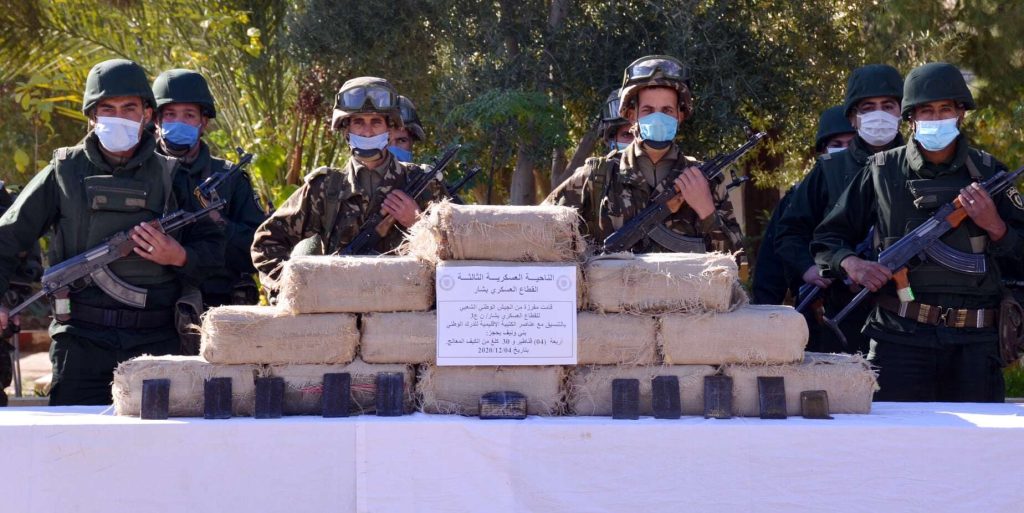 وجاء في الحصيلة العملياتية للجيش الوطني الشعبي في مكافحة التهريب والجريمة المنظمة في الفترة الممتدة من 1 جانفي 2017 إلى 24 فيفري 2021، حسبما نقله موقع الإذاعة الوطنية، أن محاربة محاولات إغراق الجزائر بالمخدرات من طرف المغرب، أسفرت عن توقيف 3183 تاجر مخدرات وحجز 2013.86 قنطار من الكيف المعالج و775 261 6 قرص مهلوس.