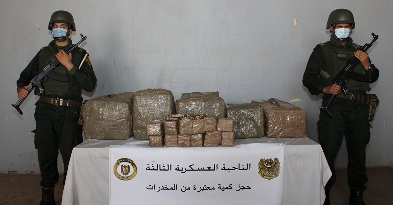 وفي إطار عمليات محاربة الجريمة المنظمة، ومواصلة للجهود الحثيثة الهادفة إلى التصدي لآفة الاتجار بالمخدرات ببلادنا، أوقفت مفارز مشتركة للجيش الوطني الشعبي, بالتنسيق مع مختلف مصالح الأمن، بإقليمي الناحيتين العسكريتين الثانية والثالثة، 17 تاجر مخدرات وأحبطت محاولات إدخال كميات كبيرة من المخدرات عبر الحدود مع المغرب، تقدر بـ 9 قناطير و13 كيلوغرام من الكيف المعالج، في حين تم توقيف 16 تاجر مخدرات آخرين وضبط 64 كيلوغرام من نفس المادة وكذا 97370 قرص مهلوس خلال عمليات مختلفة عبر النواحي العسكرية الأخرى.