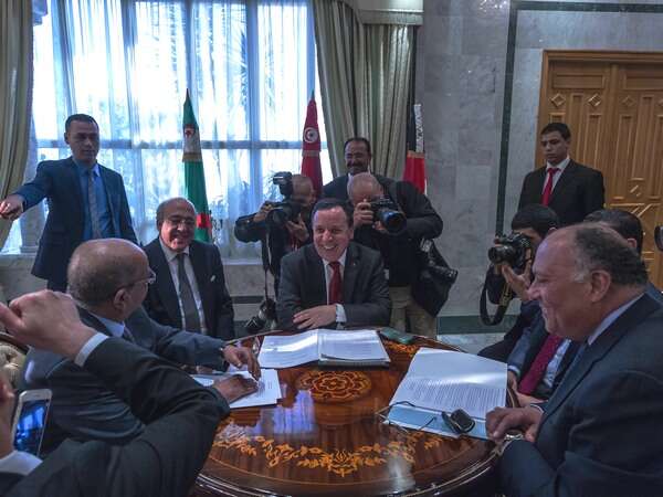 وأعلنت الجزائر عن استضافتها اجتماعا لوزراء خارجية دول الجوار الليبي فيما يقوم السراج رئيس حكومة الوفاق هذا الثلاثاء بزيارة إلى الجزائر، حيث قال وزير الشؤون الخارجية التونسي خميس الجهيناوي، إن لقاء السراج وحفتر في أبو ظبى “ودخول الإمارات العربية المتحدة على الخط، لا يعد سحبا للبساط من تحت أقدام المبادرة التونسية” لحل الأزمة الليبية.