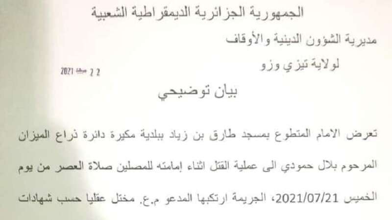 أصدرت مديرية الشؤون الدينية والأوقاف لولاية تيزي وزو بيانا بشأن تعرض إمام لجريمة قتل على يد مختل عقليا أثناء تأديته لصلاة العصر بمسجد طارق بن زياد ببلدية ميكرة دائرة ذراع الميزان.