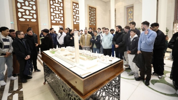 وفي مشهد ذي دلالة روحية عميقة، يُشارك الطلبة في قراءة جماعية لسورة الكهف، قبيل صلاة الجمعة، في ممارسة تعبّر عن أحد مظاهر المرجعية الدينية الحيّة؛ وتُجسّد ارتباط العبادة بالبعد الجماعيّ والوجدانيّ، قبل أدائهم صلاة الجمعة في رحاب الجامع.