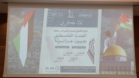 برعاية السّيّد محمّد المأمون القاسميّ الحسنيّ، وزير الدولة، عميد جامع الجزائر، نظم المركز الثقافي، لقاء فكريًا وأدبيًا، يوم الاثنين 07 صفر 1446هـ، الموافق 12 أوت 2024م، تحت عنوان: “الحدث الفلسطيني بعيون جزائريّة”، تضمن قراءات شعرية ونثرية عبر من خلالها المشاركون عن مناصرتهم للقضية الفلسطينية ومدى ارتباط المثقفين الجزائريين فكريا ووجدانيا بما يحدث في غزة من إبادة للشعب الفلسطيني. وخلال إشرافه على انطلاق فعاليات هذا اللقاء، أكد مدير ديوان عميد جامع الجزائر، بوزيد بومدين، في كلمة ألقاها باسم عميد جامع الجزائر، الشيخ محمد المأمون القاسمي الحسني، أن “فلسطين طالما ارتبطت بوجدان الشعوب ومثقفيها من خلال القصائد الشعرية والنصوص الأدبية والمقالات الفكرية، وقد تناولت عديد الأسماء الجزائرية القضية الفلسطينية من خلال مقالات ونصوص فضحت التآمر العالمي على فلسطين وعبرت عن قناعة الشعب الجزائري بعدالة القضية الفلسطينية“. وأشار في السياق ذاته، إلى مقالات برزت خلال الحركة الوطنية لعلماء ومفكرين وأدباء جزائريين على غرار العلامة عبد الحميد ابن باديس والشيخ محمد البشير الإبراهيمي. وقد تمكن الرعيل الأول من المثقفين ورواد الحركة الوطنية، يضيف المتحدث، من “التأسيس لتقليد مناصرة القضايا التحررية في العالم، وقد كانت ثورة التحرير 1954 هي مفصل هذه القيمة الأخلاقية والسياسية والدينية وهي مناصرة حق الشعوب في استقلالها”. ومن جهة أخرى، تفاعل أساتذة جامعيون وكتاب مع الحدث الفلسطيني من خلال ما تبثه وسائل الإعلام الدولية، حيث أكد كل من مشري بن خليفة ورابح خدوسي على أن “المثقف الجزائري يتفاعل مع القضية الفلسطينية على أنها قضيته من خلال نشر مجموعات قصصية وروايات وقصائد تعبر عن الألم الذي يشعر به الإنسان اتجاه الظلم والإبادة المخطط لها ضد الشعب الفلسطيني“.