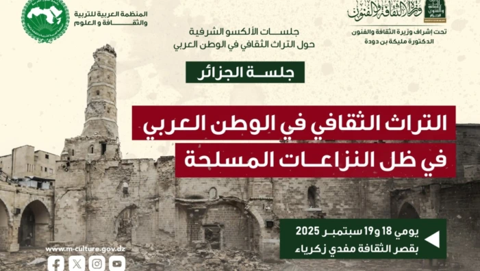 تحت إشراف السيدة وزيرة الثقافة والفنون الدكتورة مليكة بن دودة، سيحتضن قصر الثقافة “مفدي زكرياء” يومي 18 و19 سبتمبر الجاري “أشغال جلسات التراث الثقافي في الوطن العربي”.