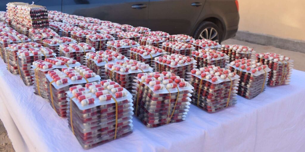 وأوضح المصدر، أن العملية تمت أثناء قيام أفراد الفرقة الإقليمية للدرك الوطني ببلدية المحرة بخدمة شرطة الطريق على مستوى الطريق الوطني رقم 47، حيث تم توقيف سيارة على متنها شخصين وأسفر تفتيشها عن العثور بداخلها على 9750 كبسولة مهلوسة كانت مخبأة بإحكام وبعد التنسيق مع وكيل الجمهورية لدى محكمة الأبيض سيدي الشيخ تم تمديد الاختصاص إلى ولايات مجاورة حيث تم توقيف شخصين آخرين من عناصر الشبكة، يضيف ذات المصدر. كما مكنت العملية من حجز سيارتين ومبلغ مالي قدره 78 ألف دج إضافة إلى ستة هواتف نقالة وبعد استكمال التحقيق سيتم تقديم الموقوفين أمام وكيل الجمهورية لدى محكمة الأبيض سيدي الشيخ من أجل جناية تكوين جمعية أشرار لغرض الإعداد لجناية التهريب باستعمال وسيلة نقل عن درجة من الخطورة يهدد الأمن الوطني والاقتصاد الوطني والصحة العمومية وجنحة ممارسة غير شرعية لمهن الصحة وجنحة استغلال وتوزيع مواد صيدلانية دون رخصة من المصالح المختصة، وفقا لذات المصدر.