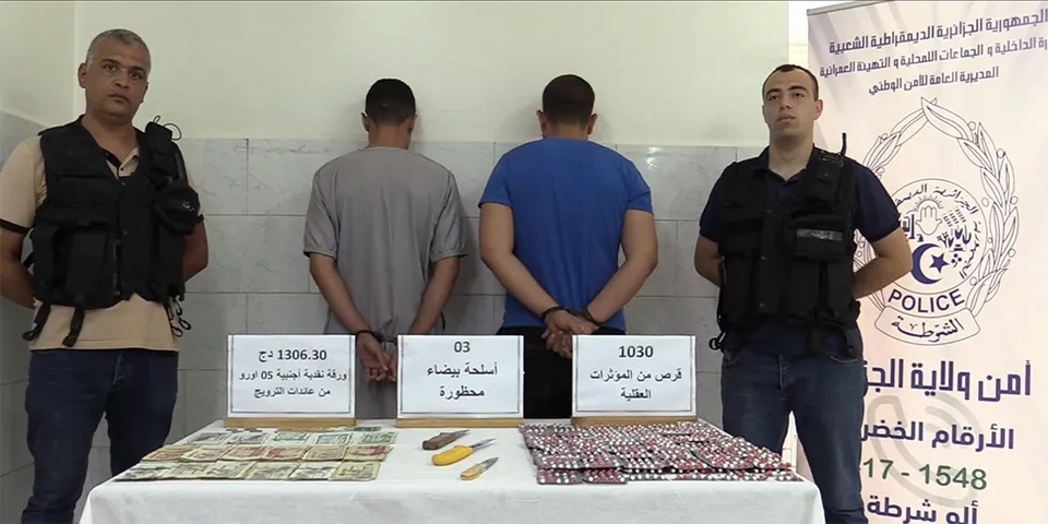 وأوضح بيان لذات المصالح، السبت، أن العملية أفضت لتوقيف شخصين مشتبه فيهما، مع ضبط وحجز 1030 كبسولة من المؤثرات العقلية، وكذا مبلغ مالي بالعملة الوطنية يقدر بـ1306.30 دج، إضافة لثلاثة أسلحة بيضاء محظورة.