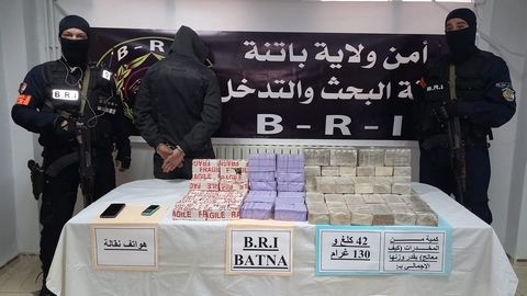 حجز عناصر فرقة البحث والتدخل بالمصلحة الولائية للشرطة القضائية بأمن ولاية باتنة، 42 كلغ و130 غرام من الكيف المعالج، حسب بيان صدر اليوم الثلاثاء عن خلية الاتصال والعلاقات العامة لهذا السلك النظامي.