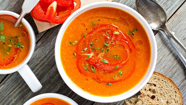 نضع الزيت في قدر على النار ثم نضيف البصل والجزر والثوم ونقلي الكل جيدا، نضيف البرتقال والفلفل الأحمر والتوايل تم نضيف مرق الدجاج، يترك ليغلي ثم نخفض درجة الحرارة ويترك على النار حوالي 10 دقائق.