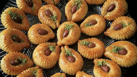 نشكل أصابع صغيرة نبسطها على مشط خاص بالحلويات مدهون بالزيت ونضغط عليه ثم نقوم بلفه على نفسه، نتحصل على شكل أصبع به خطوط غميقة نقوم بجمع أطراف الأصبع المتحصل عليه، نضغط جيدا حتى نتحصل على شكل دمعة ندهن وجه حبات الحلوة بصفار البيض الممزوج مع قطرات من الحليب ونضعهم بصينية الخبز ممكن تركهم بدون إضافة أو وضع بالمنتصف حبة لوز بقشوره، تدخل لفرن مسخن مسبقا حتى تأخذ اللون الذهبي الجميل من 15 إلى 20 دقيقة مباشرة بعد اخراجها من الفرن وهي بالصينية تسقى جيدا بالسيرو مثل البقلاوة التركية ونتركها تتشرب. تزين بالفستق المطحون.