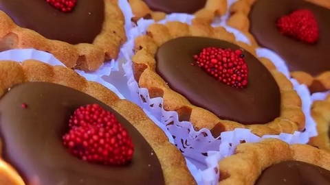 نشكل كريات من العجينة متساوية الحجم، ثم نضعها داخل القوالب الخاصة وندخلها للفرن بدرجة حرارة متوسطة، وبعد أن تطهى نضع داخلها توفيا كراميل ونذوب الشوكولا.
