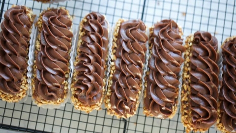 نمزج شوكولاطة الطلي مع المارغرين جيدا ونقوم بتلصيق قطعتين من الخشيبات مع بعضهما بواسطة دهن الأولى بطبقة رقيقة من مزيج شوكولاطة الطلي والمارغرين حتى ننهي جميع القطع ونحتفظ بباقي المزيج بكيس حلواني للتزيين لاحقا.