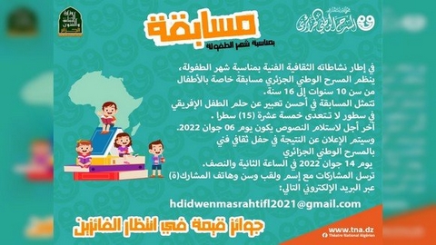 أطلق المسرح الوطني الجزائري محيي الدين بشطارزي، مسابقة مخصصة للأطفال عن أفضل نص يعبر عن حلم الطفل الإفريقي، بمناسبة اليوم العالمي للطفل واليوم العالمي للطفل الإفريقي اللذان يحتفل بهما على التوالي في 1 و16 جوان من كل سنة.
