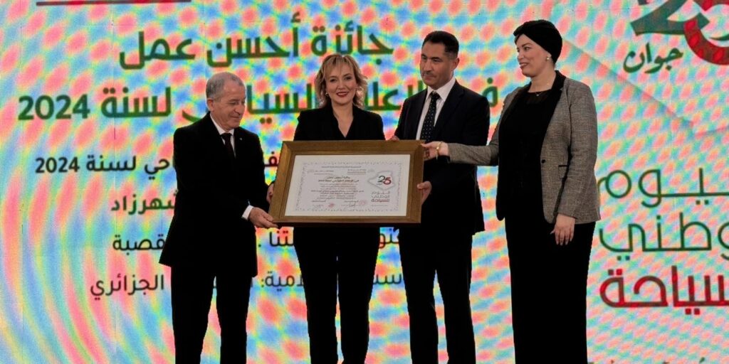 وفي كلمة له خلال مراسم حفل توزيع الجوائز على الفائزين في مسابقة أحسن عمل في الإعلام السياحي، تلاها بالنيابة عنه رئيس ديوان الوزارة، عبد الحميد ترغيني، أوضح السيد ديدوش، أن مساهمة قطاعه في التنمية المحلية تجسد من خلال توافد حوالي 3.3 مليون سائح منهم 2.2 مليون سائح أجنبي، ارتفاع الحظيرة الفندقية إلى 1650 وحدة بـ152.000 سرير، بلوغ عدد وكالات السياحة والأسفار أكثر من 5000 وكالة، وكذا إحصاء أكثر من 200 دليل في السياحة وطني ومحلي. وأشار في نفس الإطار، إلى أنه تم الانطلاق في إنجاز 800 مشروع سياحي، يمكنه توفير 90 ألف سرير و45 ألف منصب شغل. كما تطرق للمقومات الطبيعية والحافظة العقارية للقطاع، والتي تضم 1600 كلم من الشريط الساحلي، حضائر طبيعية مصنفة مع تراث مادي و لامادي معتبر، 249 منطقة توسع سياحي مصنفة، 282 منبع حموي، مبرزا أن هذه المقدرات قابلة لتعزيز الوجهة الجزائرية ولاحتضان الاستثمارات في المجال السياحي وفيما تعلق بمسابقة أحسن عمل في الإعلام السياحي المنظمة ضمن فعاليات إحياء اليوم الوطني للسياحة تحت شعار: “إعلام هادف لسياحة رائدة”، فأوضح أن المبادرة نظمت نظرا لأهمية الصحافة في إبراز المؤهلات السياحية والمساهمة في بناء المقصد السياحي الجزائري، والرفع من مستوى جاذبية وتنافسية الوجهة السياحية للجزائر على الصعيد الدولي. كما أضاف، أن المبادرة تأتي دعما للديناميكية التي يعرفها حاليا قطاع السياحة والصناعة التقليدية على غرار تشجيع الاستثمار، تحسين جودة الخدمات و الرقمنة في شتى المجالات. هذا، وحضر مراسم هذا الاحتفال وزير الاتصال، محمد لعقاب، وزيرة الثقافة والفنون، صورية مولوجي، ممثلين عن الهيئات الرسمية ومدراء عدد من المؤسسات الإعلامية.