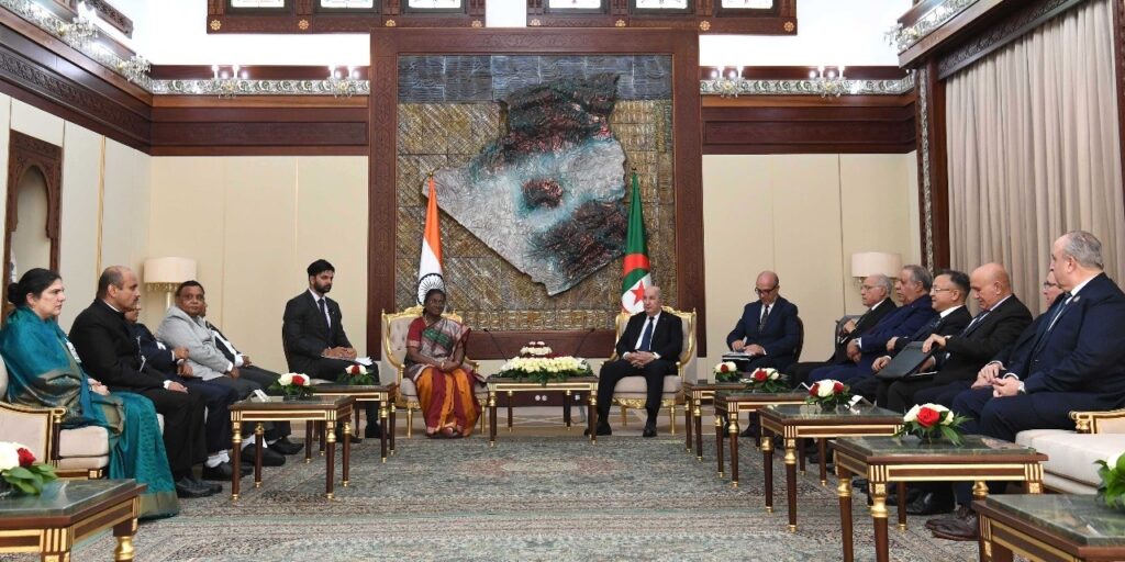 أجرى رئيس الجمهورية، السيد عبد المجيد تبون، محادثات على انفراد مع رئيسة جمهورية الهند، السيدة دروبادي مورمو، لتتوسع فيما بعد لتشمل أعضاء وفدي البلدين.