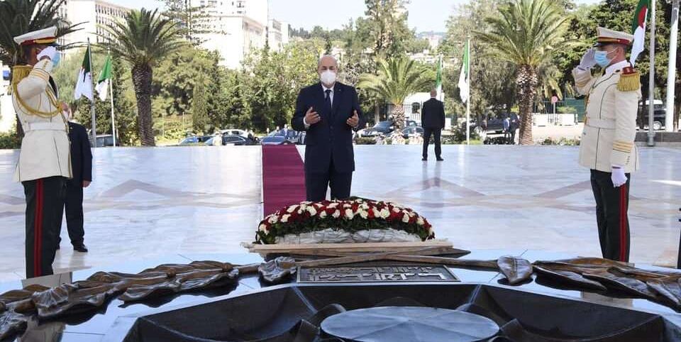 وبعد أن استعرض تشكيلة من الحرس الجمهوري أدت له التحية الشرفية وضع الرئيس تبون الذي كان مرفوقا بكبار المسؤولين في الدولة و الجيش, اكليلا من الزهور أمام النصب التذكاري وقرأ فاتحة الكتاب ترحما على أرواح شهداء الثورة التحريرية.