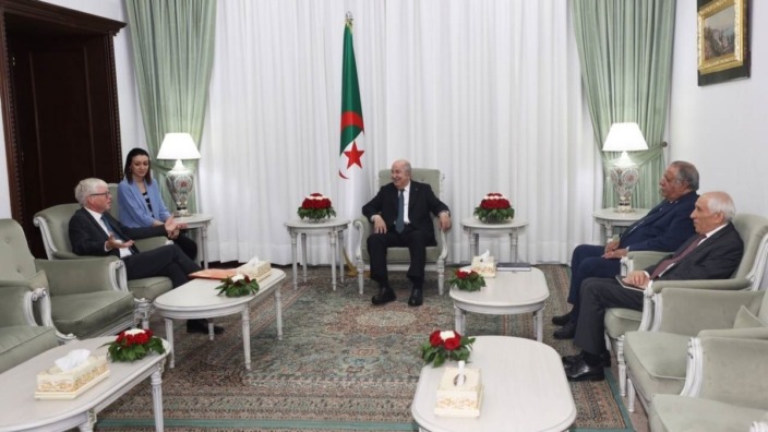 وحضر اللقاء، السيد بوعلام بوعلام, مدير ديوان رئاسة الجمهورية والسيد عمار عبة, مستشار لدى رئيس الجمهورية, مكلف بالشؤون الدبلوماسية.