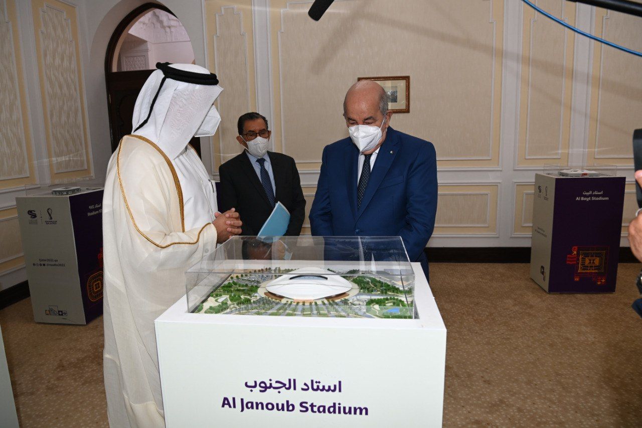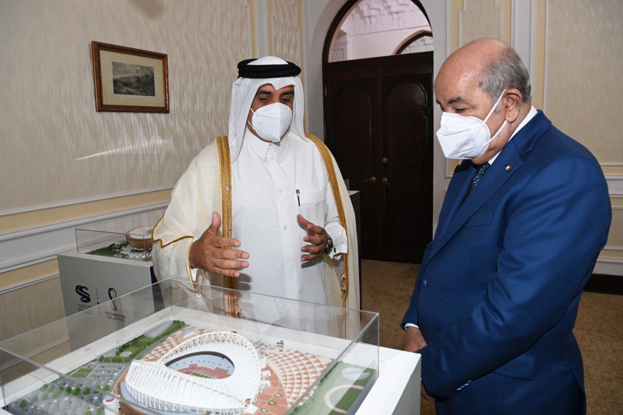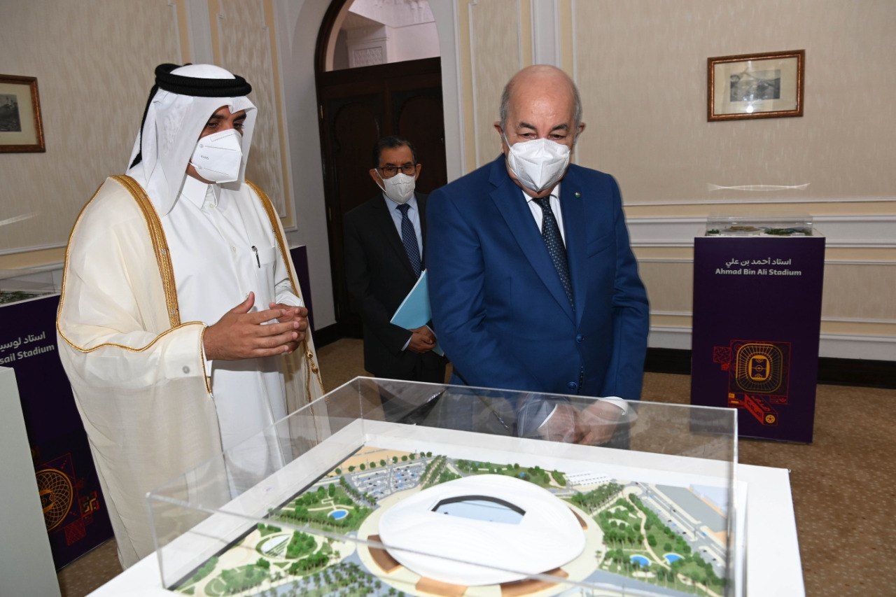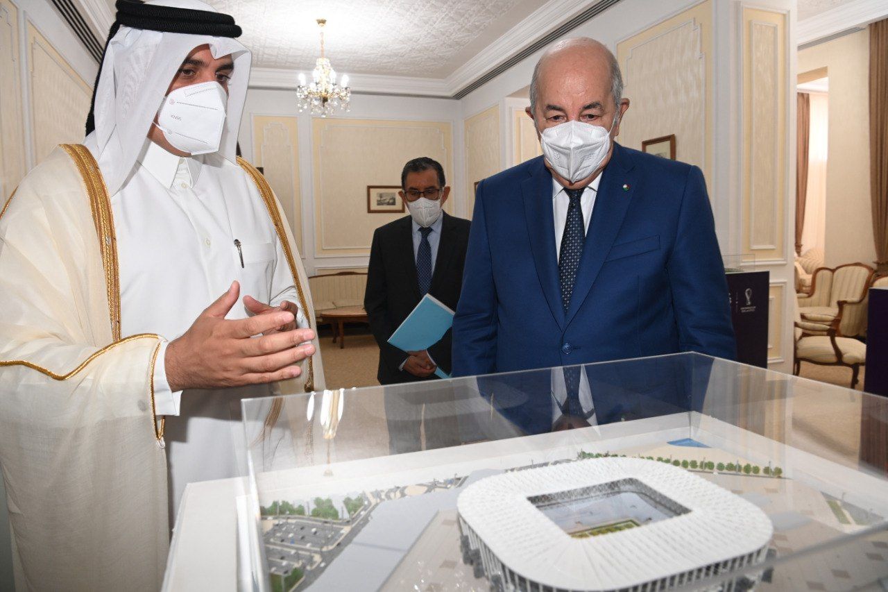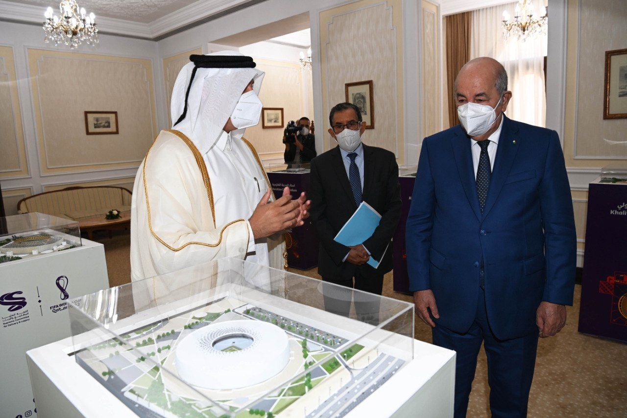 استقبل، اليوم، رئيس الجمهورية، السيد عبد المجيد تبون، سعادة سفير دولة قطر بالجزائر، السيد عبد العزيز علي النعمة، الذي عرض أمام السيّد الرئيس، مجسمات لثمانية (08) ملاعب، ستقام عليها مباريات كأس العالم 2022.