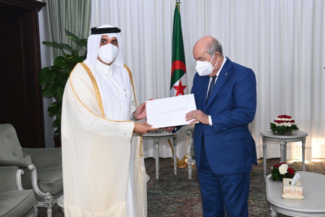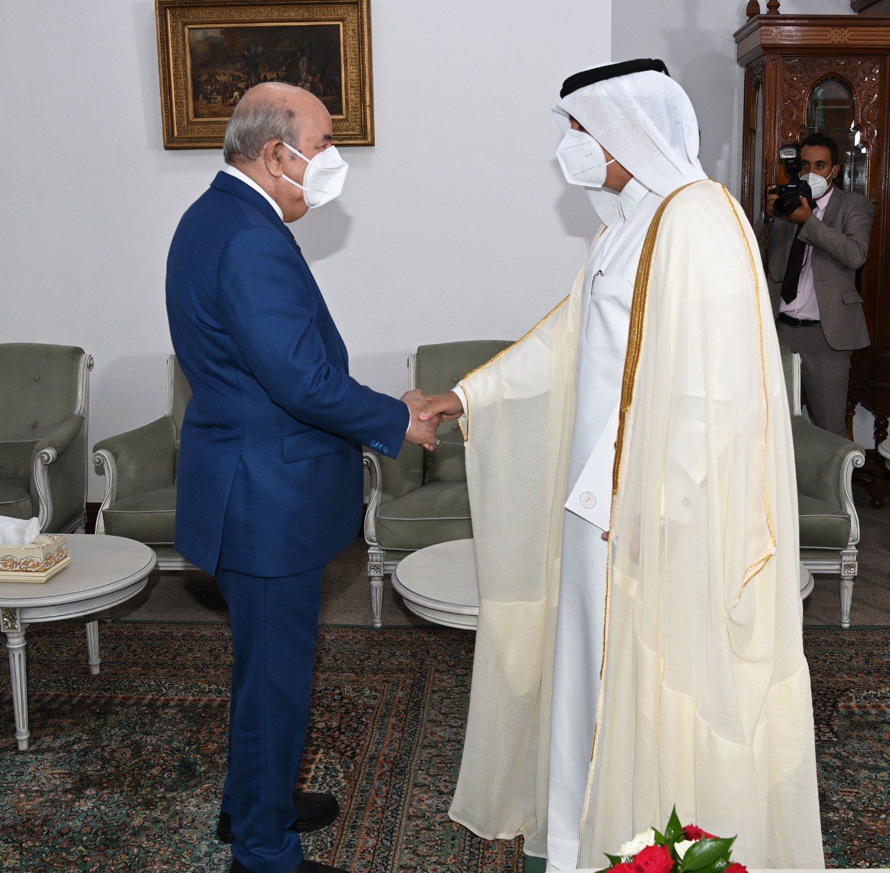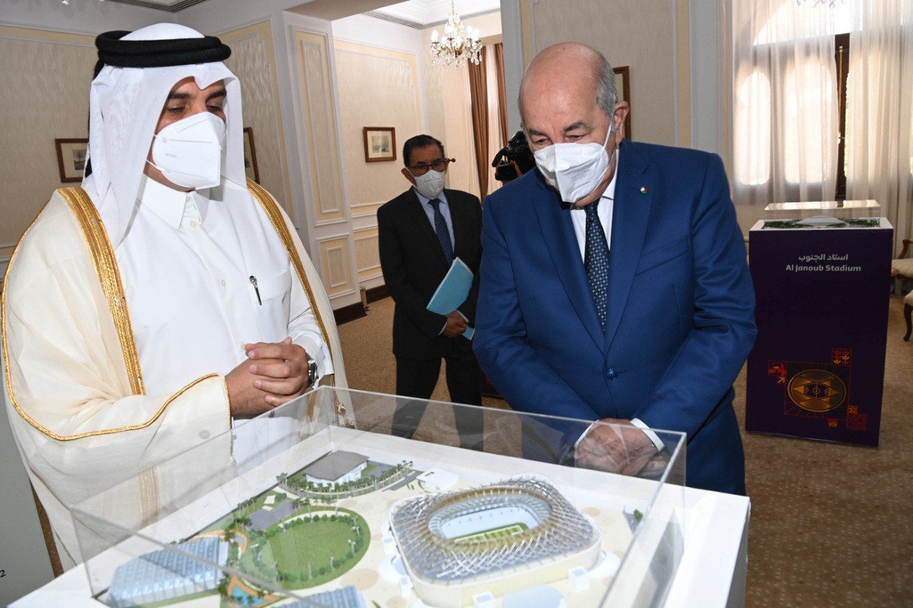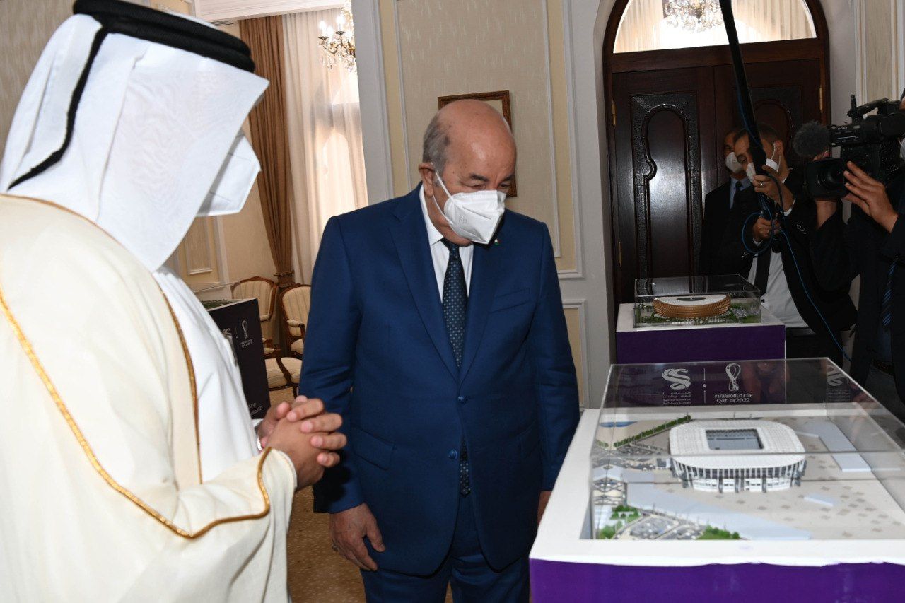 استقبل، اليوم، رئيس الجمهورية، السيد عبد المجيد تبون، سعادة سفير دولة قطر بالجزائر، السيد عبد العزيز علي النعمة، الذي عرض أمام السيّد الرئيس، مجسمات لثمانية (08) ملاعب، ستقام عليها مباريات كأس العالم 2022.