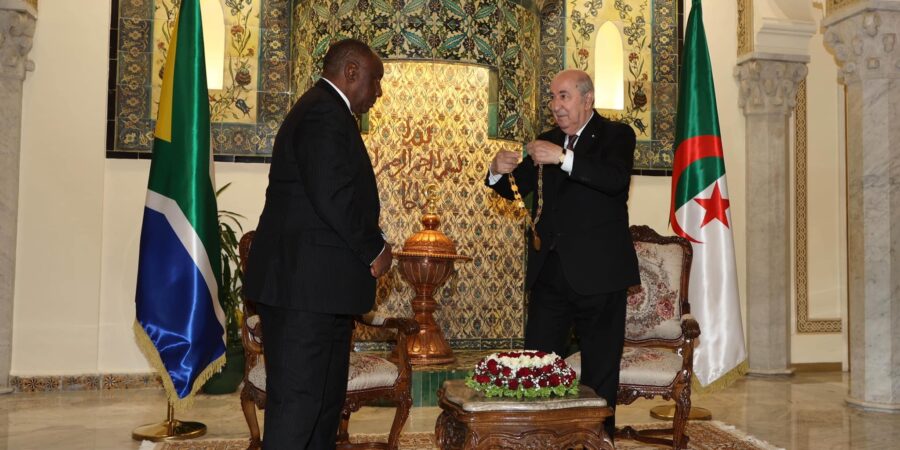 وبمناسبة زيارة دولة التي يقوم بها رئيس جمهورية جنوب إفريقيا الشقيقة إلى الجزائر، قرر السيد عبد المجيد تبون، رئيس الجمهورية، صدر مصف الاستحقاق الوطني، إسداء وسام من مصف الاستحقاق الوطني، برتبة أثير، لأخيه السيد سيريل رامافوزا، نظير مجهودات شخصه السامي ولدولة جنوب إفريقيا حكومة وشعبا، إكبارا وتنويها بدورها المميز في الدفاع عن القيم الإنسانية المشتركة في المحافل الدولية وكشف جرائم الإبادة التي يتعرض لها الشعب الفلسطيني الشقيق من قبل نظام الأبرتايد للكيان الإسرائيلي.