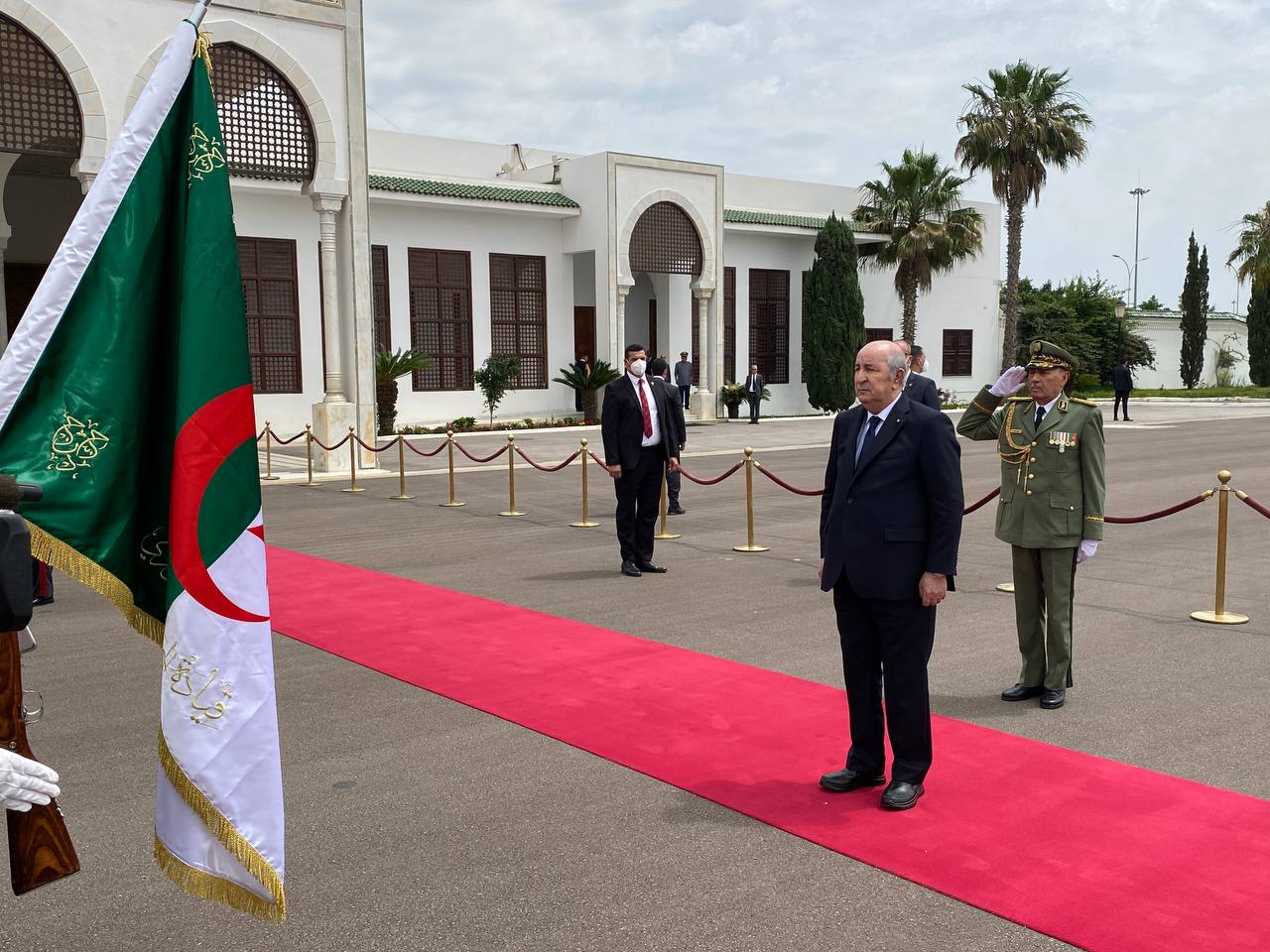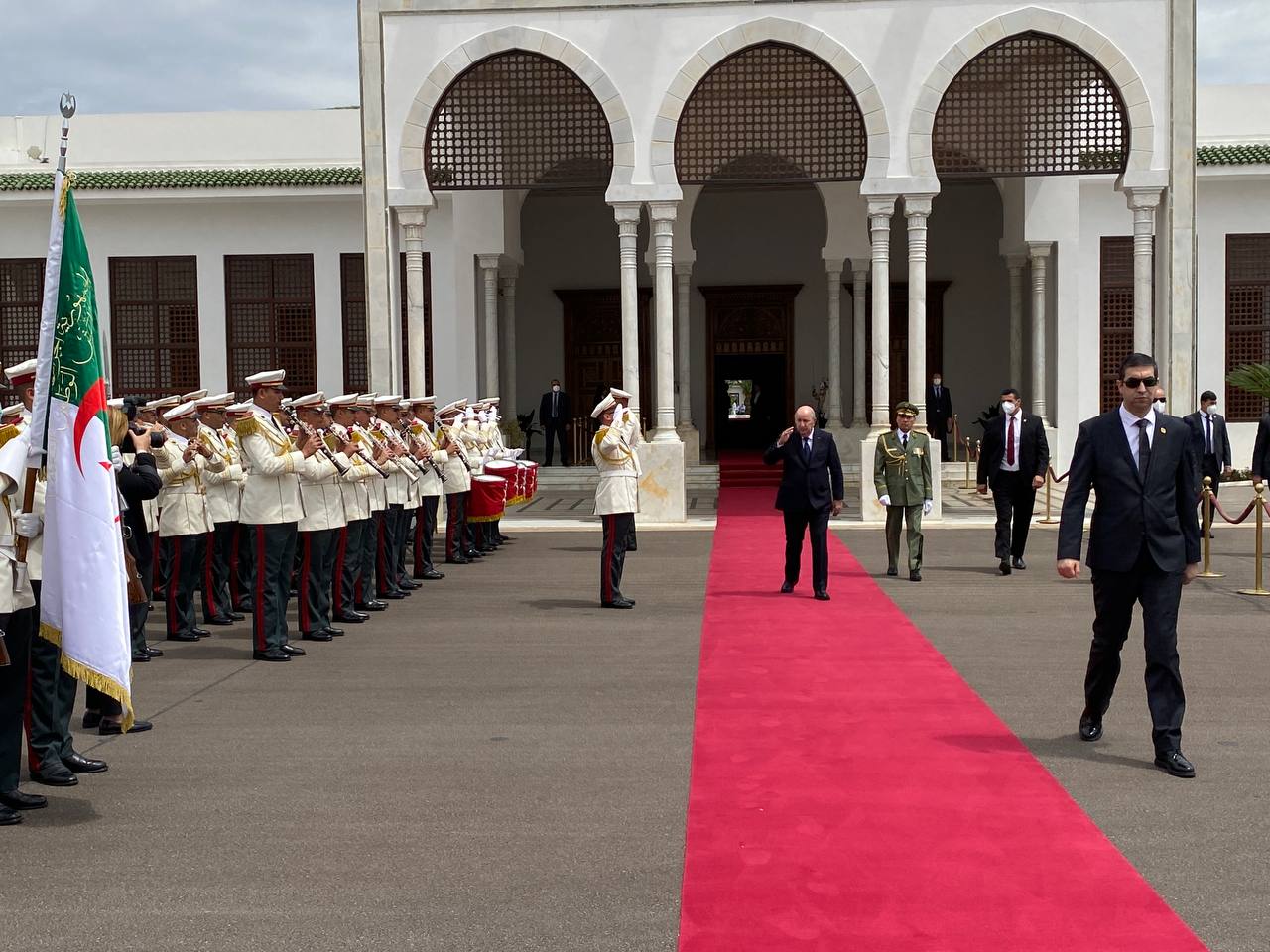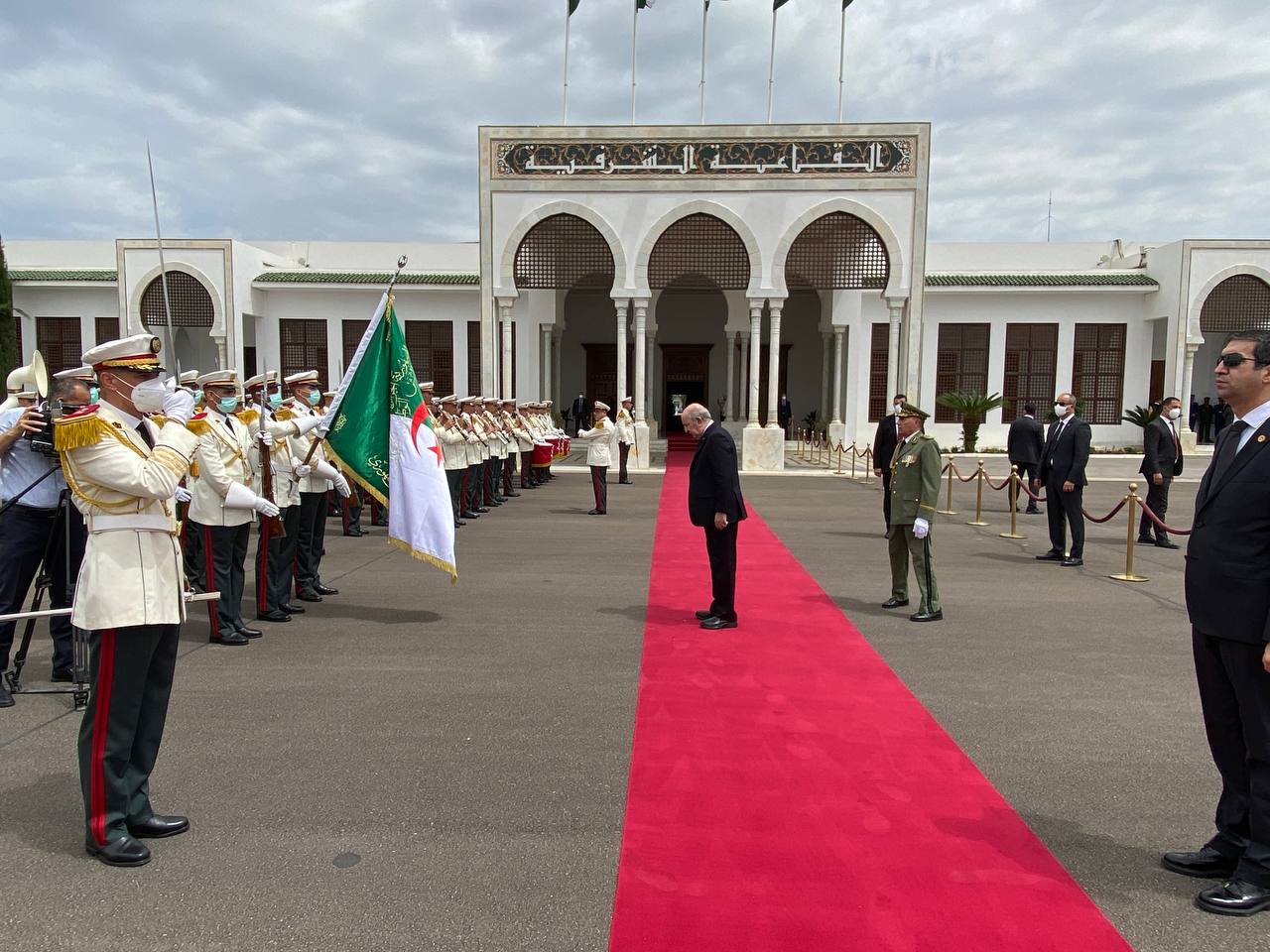 وبعد أن استمع إلى النشيد الوطني, استعرض الرئيس تشكيلة من الحرس الجمهوري أدت له التحية الشرفية.