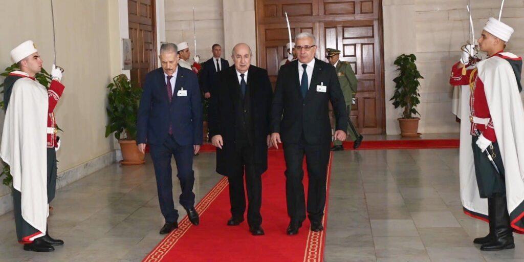 كان في استقبال رئيس الجمهورية بمدخل قصر الأمم كل من رئيس مجلس الأمة صالح قوجيل، ورئيس المجلس الشعبي الوطني ابراهيم بوغالي.