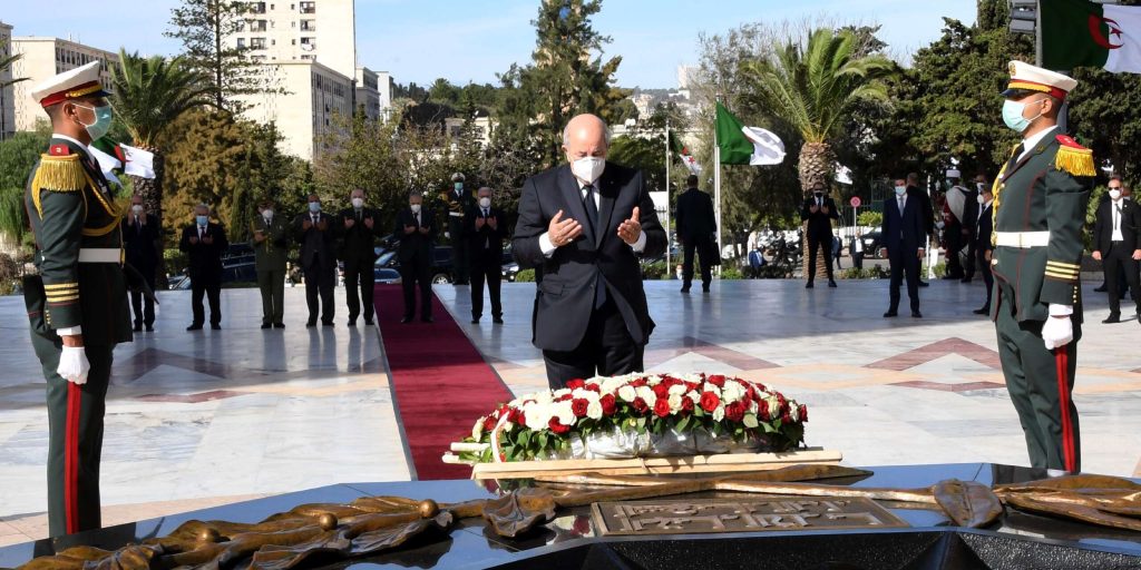 وقام الرئيس تبون بوضع إكليل من الزهور أمام النصب التذكاري والوقوف دقيقة صمت وقراءة فاتحة الكتاب ترحما على أرواح شهداء الثورة التحريرية المظفرة.