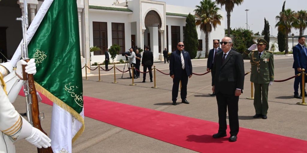 وبعد أن استمع إلى النشيد الوطني, استعرض الرئيس تبون تشكيلة من الحرس الجمهوري أدت له التحية الشرفية بمطار هواري بومدين الدولي.