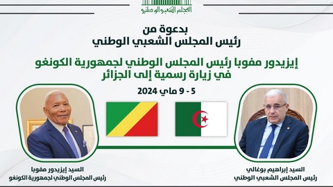 يقوم رئيس المجلس الوطني لجمهورية الكونغو, السيد إيزيدور مفوبا, بزيارة رسمية إلى الجزائر تدوم خمسة أيام بداية من اليوم الأحد, وذلك بدعوة من رئيس المجلس الشعبي الوطني, السيد إبراهيم بوغالي، حسب ما أورده بيان للمجلس.