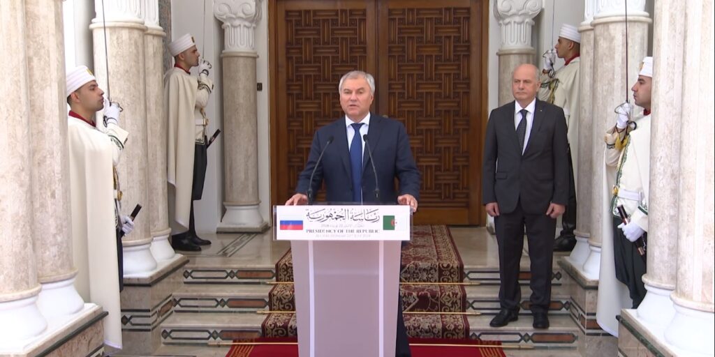 أكد رئيس مجلس الدوما لفيدرالية روسيا، السيد فولودين فياتشيسلاف فيكتوروفيتش، الإثنين، بالجزائر العاصمة، أن الجزائر دولة صديقة وشريك استراتيجي لبلاده التي تحرص على الارتقاء بالعلاقات بين البلدين إلى مستويات أعلى.