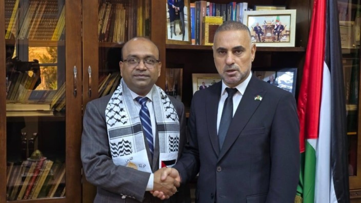 وخلال اللقاء، أطلع السفير الفلسطيني نظيره البنغالي على آخر المستجدات في الأراضي الفلسطينية، لا سيما ما يتعرض له قطاع غزة من حرب إبادة جماعية وتجويع ممنهج، وجرائم قتل يومية أمام مراكز توزيع المساعدات، التي يذهب ضحيتها عشرات الأطفال والنساء بسبب الجوع ونقص التغذية، بالإضافة إلى اعتداءات المستوطنين على القرى والمحافظات في الضفة الغربية والقدس المحتلة. من جهته، أعرب السفير محمد نجم الهدى عن شكره للسفير على حفاوة الاستقبال، مؤكداً موقف بلاده الثابت والداعم لحقوق الشعب الفلسطيني المشروعة، كما ادان بشدة الجرائم البشعة التي تُرتكب يوميًا بحق الفلسطينيين في ظل صمت غير مبرر من قبل المجتمع الدولي ومؤسساته، مشددًا على ضرورة وقف العدوان وإنهاء معاناة الشعب الفلسطيني فورًا. وفي ختام الزيارة، قدّم السفير محمد نجم الهدى، شجرة زيتون باسم جمهورية بنغلادش الشعبية، تعبيرًا عن تضامن بلاده الكامل مع القضية الفلسطينية، ورمزًا للسلام والصمود في وجه الاحتلال، حيث تم غرسها في فناء السفارة بحضور السفيرين وعدد من أعضاء وطاقم السفارة. كما قدّم السفير لنظيره البنغالي وشاحًا فلسطينيًا كهدية رمزية تعبيرا عن عمق العلاقات الأخوية بين الشعبين، وتقديرًا لموقف بنغلادش الداعم للعدالة والحرية والكرامة الإنسانية.