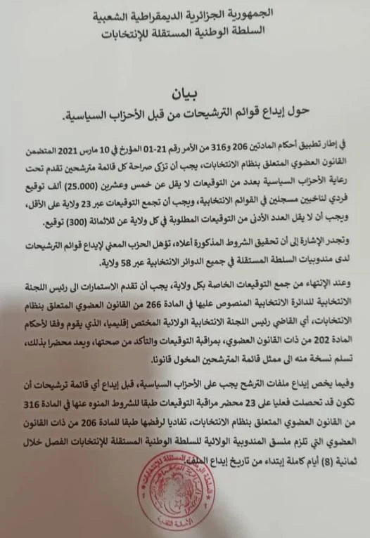 ولفتت السلطة الوطنية المستقلة للانتخابات إلى أنه يتوجب تزكية كل قائمة مترشحين تقدم تحت رعاية الأحزاب السياسية بعدد من التوقيعات لا يقل عن 25 ألف توقيع فردي لناخبين مسجلين في القوائم الانتخابية، وأنه يتم جمع التوقيعات عبر 23 ولاية على الأقل، ويجب أن لا يقل العدد الأدنى من التوقيعات المطلوبة في كل ولاية عن 300 توقيع. وهذا نص البيان كاملا: