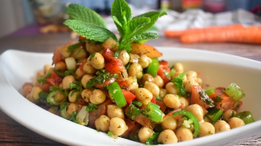 نقطع الخضروات جميعا لمكعبات صغيرة ونضيفها للحمص ثم نضيف عصير الليمون زيت الزيتون والكمون مع النعناع المجفف وكذا البقدونس والملح حسب الذوق, نخلط الكل جيدا وعند التقديم يزين بأوراق النعناع الطازجة.