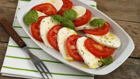 نقطع كل من الطماطم والموزاريلا الطازجة لشرائح دائرية رفيعة في صحن التقديم نرش أولا الملح والفلفل الأسود كطبقة أولى، ثم نرص بعد ذلك شرائح الطماطم والموزاريلا بالتناوب ثم نرش عليهم الملح والفلفل الأسود ونوزع فوقهم أوراق الريحان بعد ذلك الصلصة التي عبارة عن مزيج من زيت الزيتون مع خل البلسمك