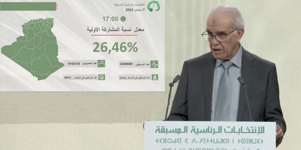 بلغت نسبة المشاركة في الانتخابات الرئاسية اليوم السبت 45ر26 بالمائة داخل الوطن و31ر18 بالمائة خارج الوطن إلى غاية الساعة الخامسة مساء, حسب ما أعلن عنه رئيس السلطة الوطنية المستقلة للانتخابات, السيد محمد شرفي. للإشارة, يتنافس في هذا الاستحقاق الرئاسي ثلاثة مترشحين, هم مرشح جبهة القوى الاشتراكية السيد يوسف أوشيش, المترشح الحر السيد عبد المجيد تبون ومرشح حركة مجتمع السلم السيد عبد العالي حساني شريف.
