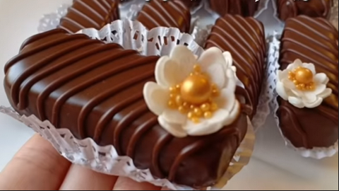نذيب الشوكولاتة ونضيف لها الزيت وتغلف الحلوى بعد أن تبرد تماما وتزين بعد أن تجف بخطوط من الشوكولاتة والورود حسب الرغبة.