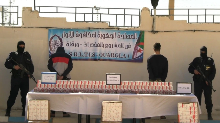 وجاء في البيان، أن “المصلحة الجهوية لمكافحة الاتجار غير المشروع بالمخدرات بورقلة تمكنت، بحر الأسبوع المنصرم، من ضبط 75 ألف كبسولة من المؤثرات العقلية من نوع بريغابالين 300 ملغ مع توقيف شخصين مشتبه فيهما، أحدهما من جنسية مغربية، كانا ينشطان ضمن شبكة إجرامية منظمة مختصة في الاتجار غير المشروع بالمؤثرات العقلية”.