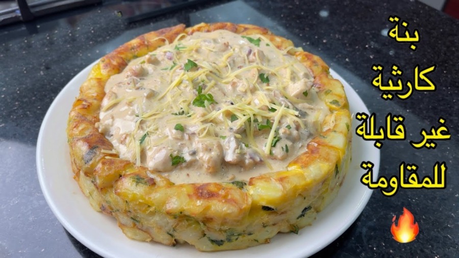 ونغلف قاعدته بورق الطهي وندهنه قليلا ثم نفرغ مزيج البطاطا والبيض وندخلها لفرن مسخن مسبقا حتى تتماسك وتأخذ اللون الذهبي الجميل. إلى ذلك الحين نضع مقلاة على النار، نقلي ونحمر قطع الدجاج مع قليل من الزيت ثم نضيف البصل ونذبله مع الدجاج ثم الفطر يقلى الكل جيدا مع التحريك حتى النضج ثم نضيف التوابل والموتارد والكريمة الطازجة ونتركه لدقائق ونطفئ. نخرج المول من الفرن ونقلبه وننزع ورق الطبخ بهدوء وإذا لاحظنا أن تورتة البطاطا لم تأخذ اللون الذهبي الجميل ندخله للفرن مرة ثانية ونشعل الشواية فقط ليحمر وجه التورتة وبعد اخراجها نفرغ وسط الفراغ الذي بالتورتة حشو الدجاج ونضيف الجبن المبشور.