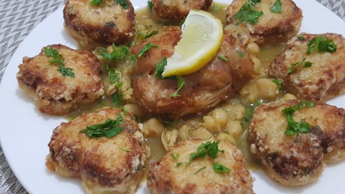 نأخذ شريحة البطاطا المتحصل عليها ونضعها أسفل القطاعة التي سنستعملها كقالب ونضيف فوقها خليط الدجاج، الجبن والبقدونس ونضغط ثم نزيل القالب، سنتحصل على قلب أو وردة متكونة من طبقتين شريحة البطاطا وحشو الدجاج، نرمدها بالفرينة ثم البيض ثم نقليها بزيت غزير على نار أقل من متوسطة لكي تطهى البطاطا وتتحمر جيدا. ممكن التأكد من استواء البطاطا بغرز سكين في صحن التقديم، نضع الصلصة والحمص، فخذ الدجاج المحتفظ به جانبا في الوسط، ونضع أشكال البطاطا والدجاج المتنوعة بالتناوب دائريا على أطراف الصحن ونزين بالبقدونس.