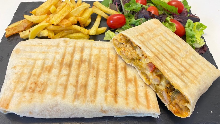 نأخذ خبز التورتيلا نضع في وسطه الدجاج ثم صلصة الجبن بكمية وفيرة ونضع كطبقة ثالثة البطاطا المقلية ثم صلصة الكاتشاب، ممكن إضافة البصل المذبل مع قليل من الزيت والفلفل الأخضر أو أوراق الخس مع شرائح الطماطم نغلق خبز التورتيلا على شكل مستطيل ويطهى بالبانينوز المسخنة.