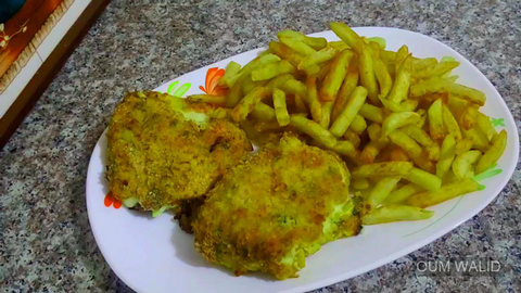 نمرر اسكالوب في الخبز اليابس المطحون ثم نضع فوقه قطعة جبن الساندويتش ثم نضع فوقه قطعة اسكالوب أخرى ثم نغمسهما جيدا في الخبز اليابس المطحون ونضعهما في قالب فرن زجاجي مدهون جيدا بالزبدة.